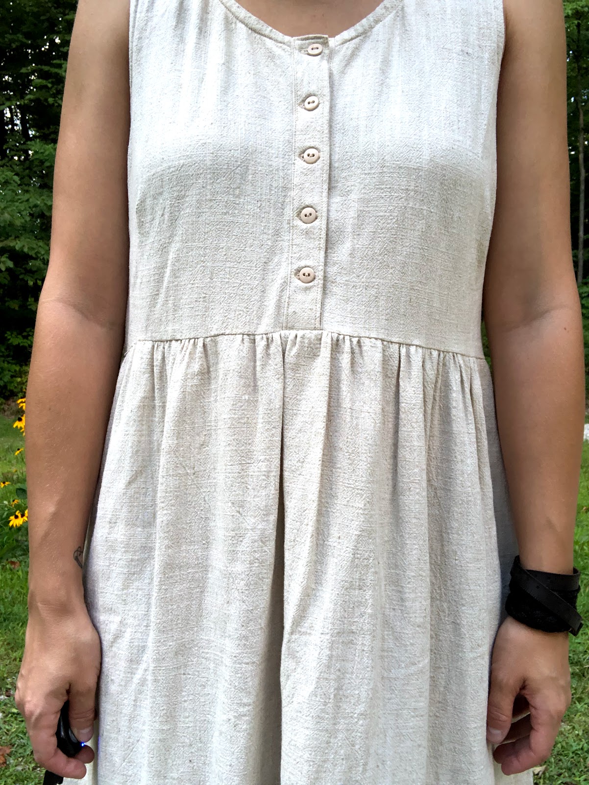 The fabric I used is making me scratch my head. I THINK that it's the black version of the pink Lyocell/rayon/linen/cotton I used for this Willamette Top. I distinctly remember making a special trip to a different Jo-Ann's to get it. I have the receipt. But the receipt does NOT say that's what it is. It's a similar weight and it does have a slight shine with pressing, so it's unlikely that it's 100% linen or cotton. Anyway, it's very soft, slightly drapey, and lightweight. I like it a lot and it gathered well. The bodice is fully lined (as well as interfaced at the top) and I think that my fabric needed that extra support.
